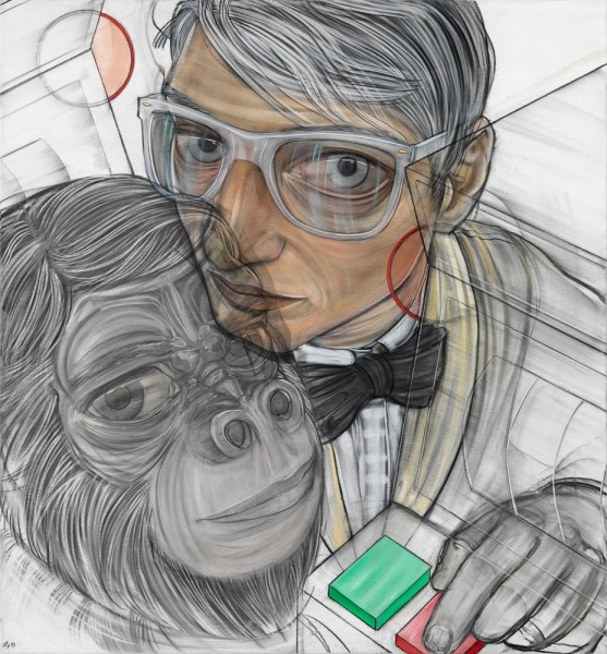 In einigen seiner Gemälde ist zuweilen auch der Künstler selbst abgebildet, manchmal wird er aber auch durch einen Affen, sein Alter Ego, vertreten. Dieser Affe steht symbolisch für den Wutbürger und der Künstler will uns im wahrsten Sinne des Wortes mitteilen, dass er sich nicht mehr länger zum Affen machen lassen möchte. So auch in den Bildern der Serie „Invisible Slotmachine“ auf welchen, neben diversen anderen Protagonisten, mitunter ein Affe aus dem Bild herausblickt. Die Wahl der Darstellung mit den einarmigen Banditen ist natürlich nicht zufällig gewählt, sondern bewusst als Kritik an der Glücksspielindustrie zu verstehen, die gerade in Krisenzeiten wie diesen, dem Bürger rasche Geldgewinne in Aussicht stellt, um dann jedoch ganz im Gegenteil noch mehr am Unglück der Betroffenen zu profitieren.