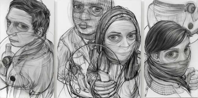 Die Protagonisten auf Schichos Bildern sind allerdings im Begriff ihr Schicksal selbst in die Hand zu nehmen. Mit der Wahl des roten Knopfs für „STOP!“ fällt die Entscheidung auch eindeutig aus. Den Gesichtsausdrücken nach zu urteilen, wollen die Dargestellten dem Beobachter auch durchaus klar machen, dass sie sich oben genannter Tatsachen sehr wohl bewusst, damit aber mit Sicherheit nicht einverstanden sind.